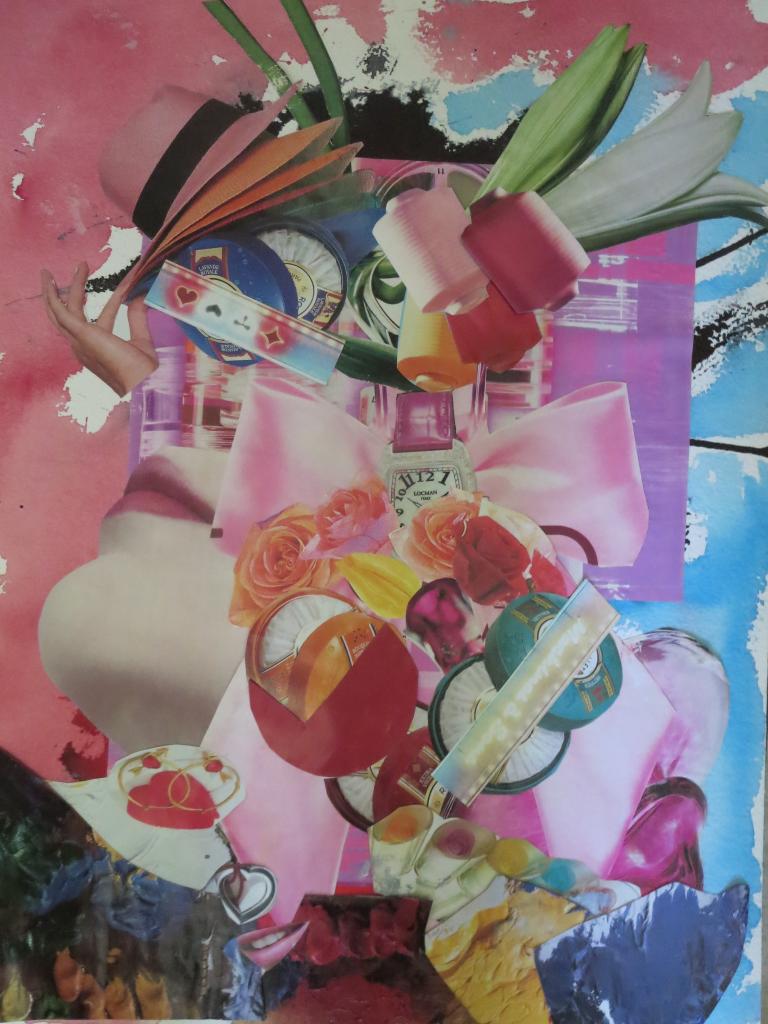 Collage sur fond à l'encre de couleur et à l'aquarelle de figures découpées dans des revues. (40 x 30 cm, 2016))
